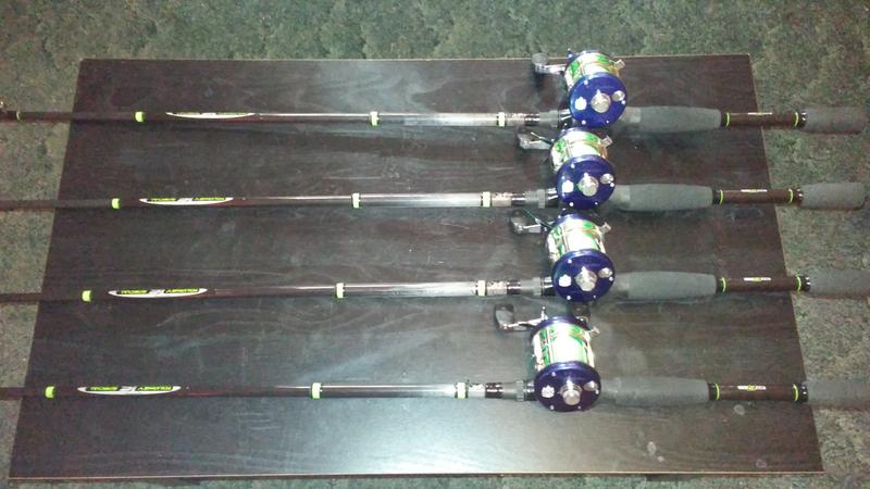 Baitcast rod and reel fishing combos.