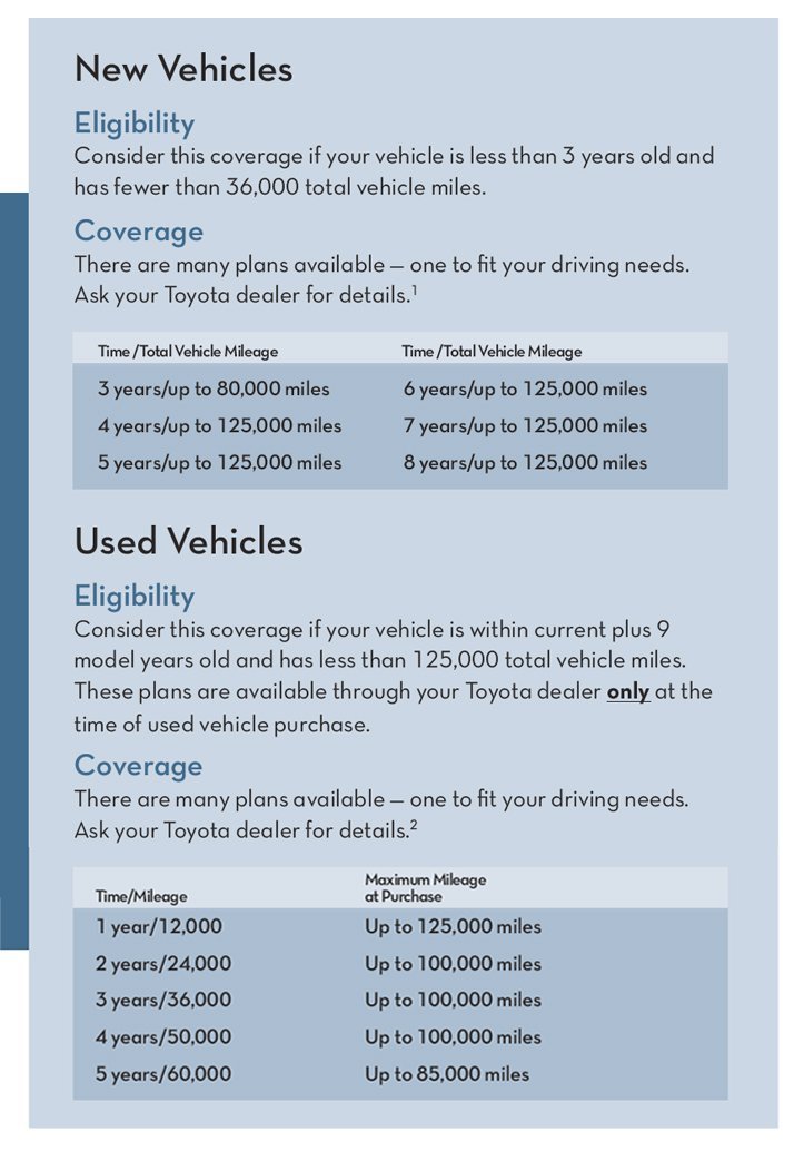 Like the other warranty plans the gold toyota care warranty will provide coverage in different increments starting with three years and 36 000 miles and going up to eight years and 125 000 miles.